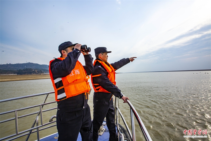 近日,江西省都昌县公安局民警在鄱阳湖水域巡查,观察候鸟情况。傅建斌 摄