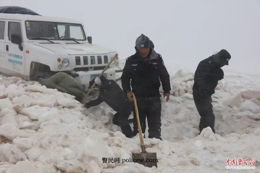 近日,青海省可可西里自然保护区公安局民警在巡逻途中清除道路积雪。赵新录 摄