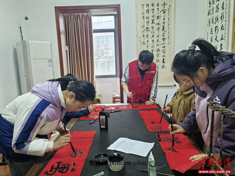 活动现场墨香四溢,红纸翻飞。湖南和顺书画院吴老师首先为大家讲解了春联的历史渊源 —— 春联由古代 “桃符” 演变而来,历经千年成为春节祈福纳祥的经典民俗,同时细致教授书写技巧,从握笔姿势到运笔力道,逐一示范指导。青少年们凝神静气,挥毫泼墨,将 “福” 字与对新年的美好祝愿倾注于笔端。