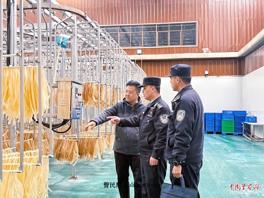 3月25日,甘肃省渭源县公安局“薯业110”民警辅警在宽粉加工车间开展安全检查。张亚军 摄