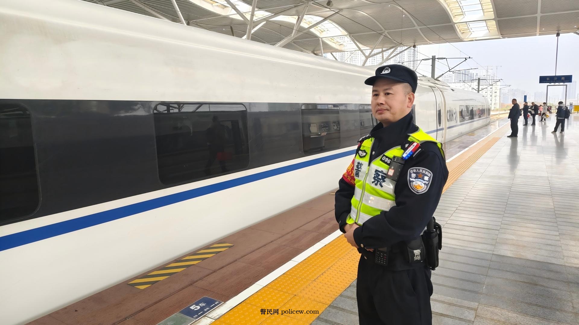 图为长沙民警护航旅客安全。
