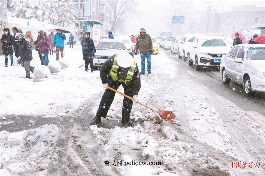 3月29日,呼伦贝尔市公安局民警清理道路上的积雪。李枝远 摄