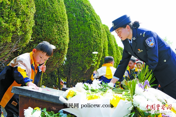 4月1日,安徽省芜湖市公安局繁昌分局组织民警辅警来到芜湖市烈士陵园,与到现场开展祭奠活动的小学生一起,以庄重仪式致敬公安英烈,汲取奋进力量。图为民警和小学生向牺牲民警的墓碑献花。侯迪 摄